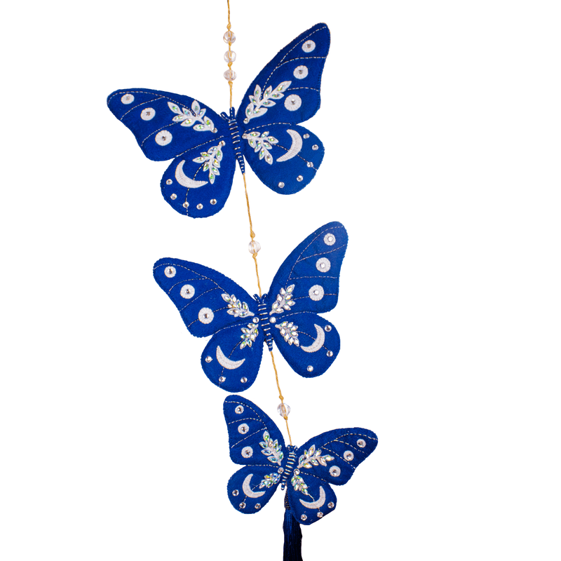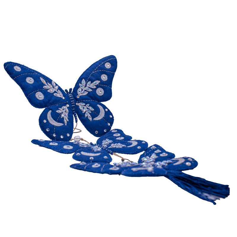 Estas borboletas não são meramente feitas de feltro; elas são tecidas com os fios da meia-noite e a dedicação de uma artesã. Cada uma carrega em suas asas a magia dos céus. A borboleta maior, guardiã da sabedoria, reflete o esplendor da lua cheia, com suas gemas cintilantes capturando a luz das estrelas mais distantes. A borboleta do meio representa a jornada e a transformação. Seus padrões lunares lembram as fases mutáveis da lua, simbolizando a constante evolução e o ciclo de renascimento. Ela nos guia através da escuridão, com a promessa de que a luz sempre retorna. Por fim, a borboleta menor, com seu véu de seda, é um eco da noite profunda. Ela carrega a promessa de sonhos e intuições, convidando a alma a mergulhar na quietude e a encontrar a paz interior. Unidas por uma linha de contas que parecem orvalhos cristalizados, estas borboletas formam um portal para o etéreo. São um lembrete de que a beleza e o amor mais profundos florescem na escuridão, iluminados pela magia que reside em nós. Elas foram criadas para suspender o amor no ar, trazendo a serenidade de um céu noturno para o seu lar.